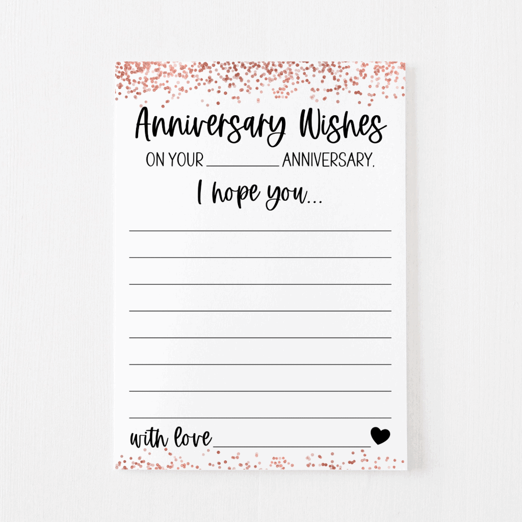 Shuffle the cards and pass them out to all guests, who in turn must write their wishes for the couple as they celebrate that particular anniversary. While many of these cards might result in duplicate responses (“I hope you’ve had a baby by now!”), opening these cards will be something husband and wife can enjoy for years to come.