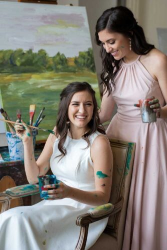 • Couple-Inspired Creations: Think “His and Hers” portraits, love birds perched on a branch, or another popular option—a romantic sunset. These fun ideas will have the bridal party painting the couple’s love story in some highly unique and expressive ways.