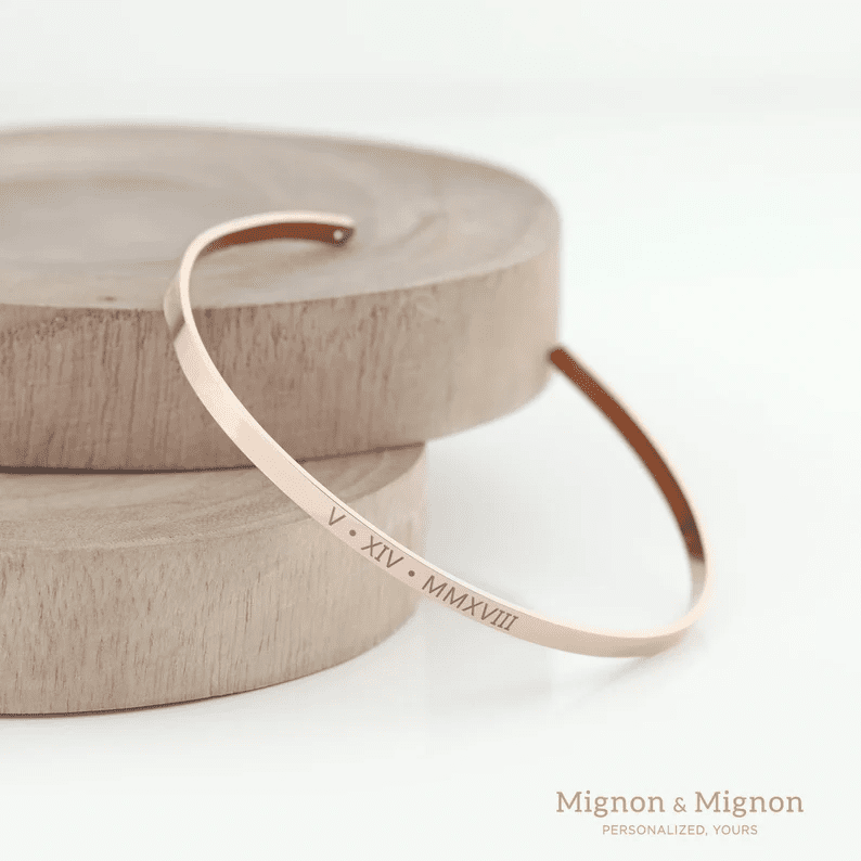 Are you looking to add a personal touch to your bridesmaid bracelets? If so, engraving is a great way to do so. This cuff-style bracelet is available in gold, rose gold, or silver and can be engraved single or double-sided with anything from a personal message to custom coordinates.