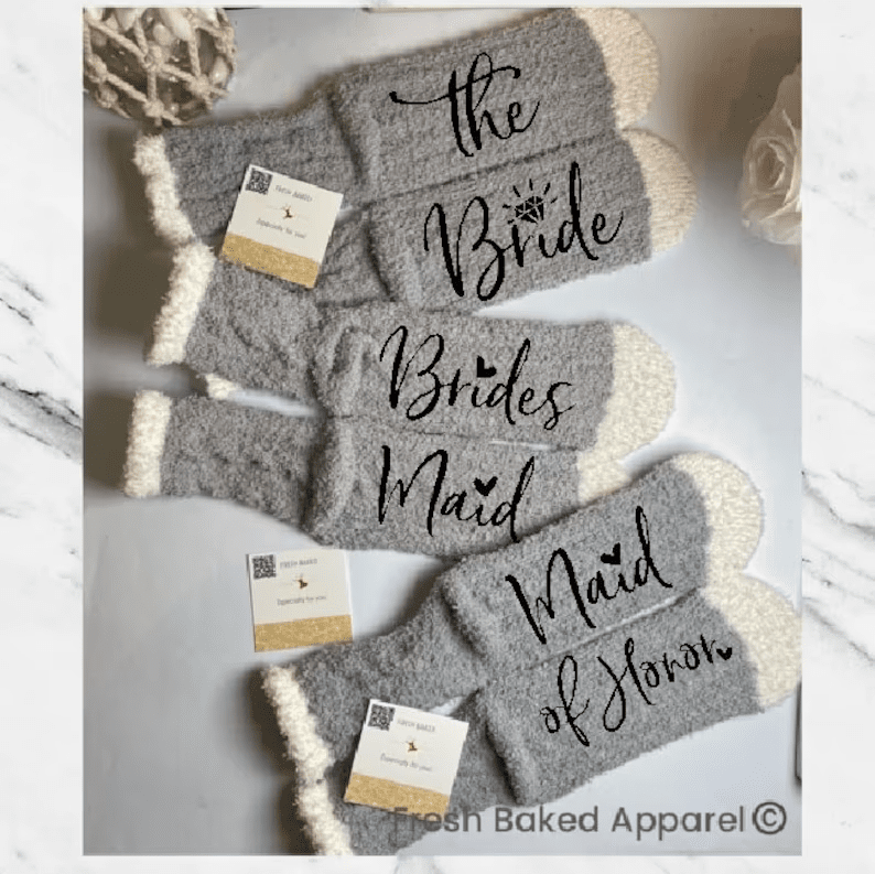 Make sure your girls’ feet stay warm and cozy on wedding morning by gifting them a cute pair of bridesmaid socks!