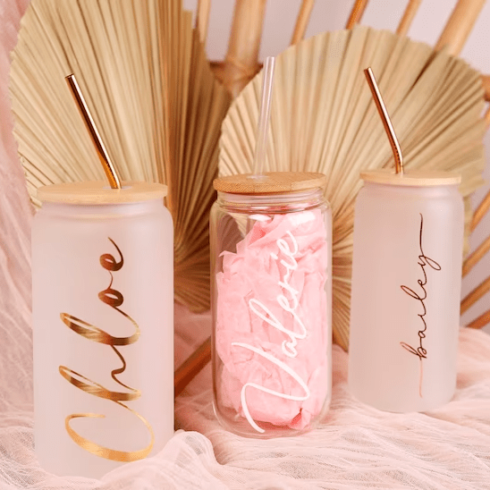 If you want your bridesmaid tumblers to be part of a larger gift, consider pairing them with a cute makeup or tote bag, a jewelry box or dish, or cozy socks or slippers. You could also fill them with smaller items like lip balm, hair ties, or sunglasses.