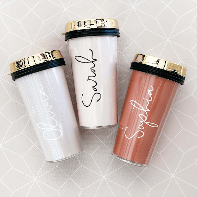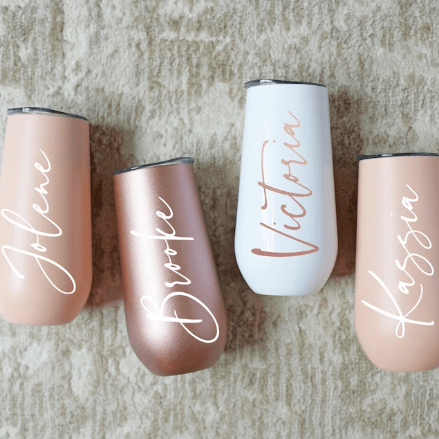 Instead of bridesmaid tumblers, you can give your girls other types of drinkware like wine glasses, shot glasses, or coffee mugs. Other bridesmaid gift ideas include jewelry, bags, and getting ready outfits/accessories.