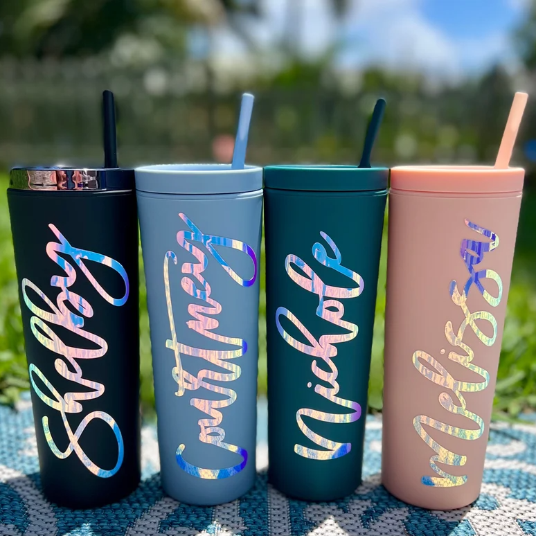 These 18 oz acrylic tumblers offer the most custom options with 10 tumbler colors, 27 vinyl colors, and 23 font choices. You can also choose to feature up to 5 words on the front or have up to 6 words printed between the front and back.