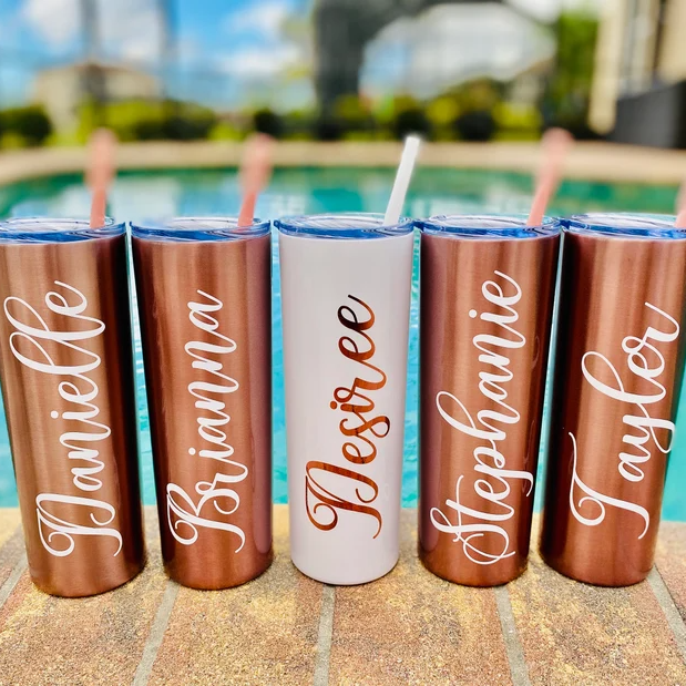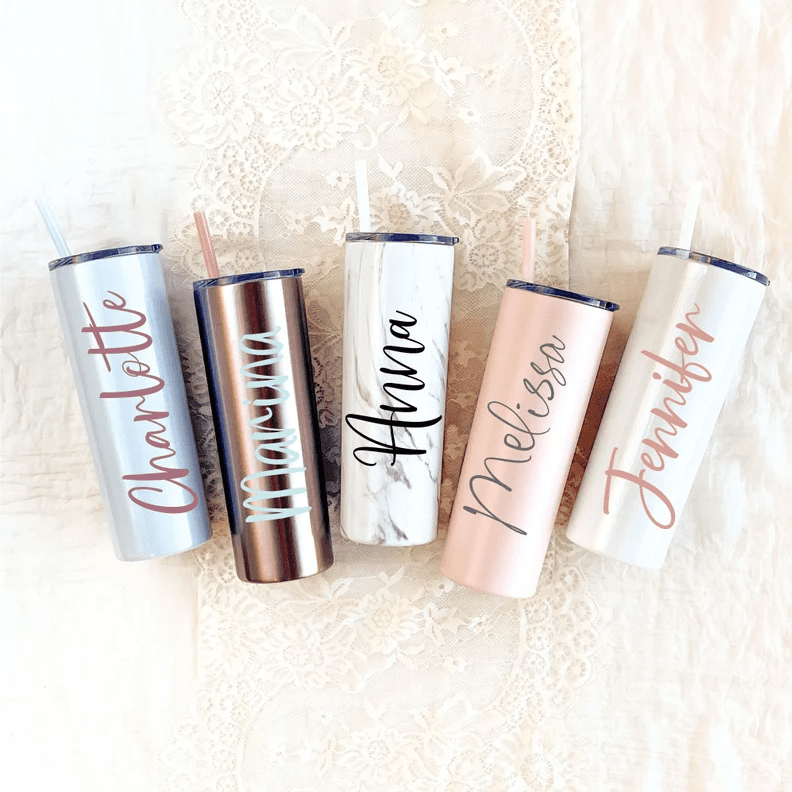 These 20 oz stainless steel tumblers can feature not only your girls’ first names but also their official bridal party titles. Available in 11 tumbler colors, over 50 vinyl colors, and 70 font choices, there is no lack of customization.