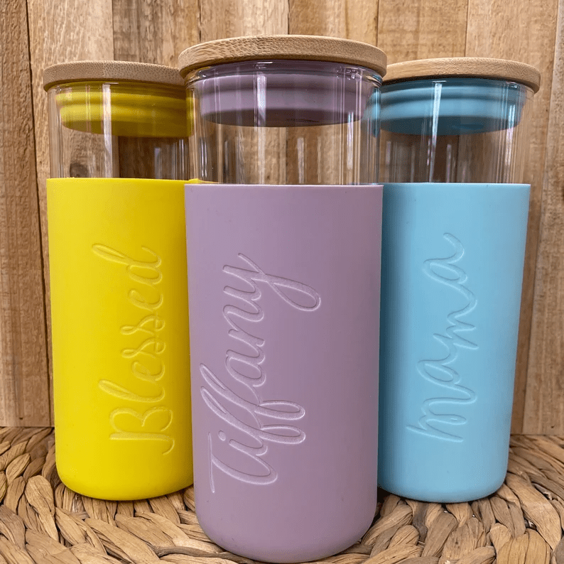 These 20 oz glass coffee tumblers feature a custom engraved silicone sleeve in 11 colors and four fonts. You can even choose to engrave the matching bamboo lid for a small additional fee.