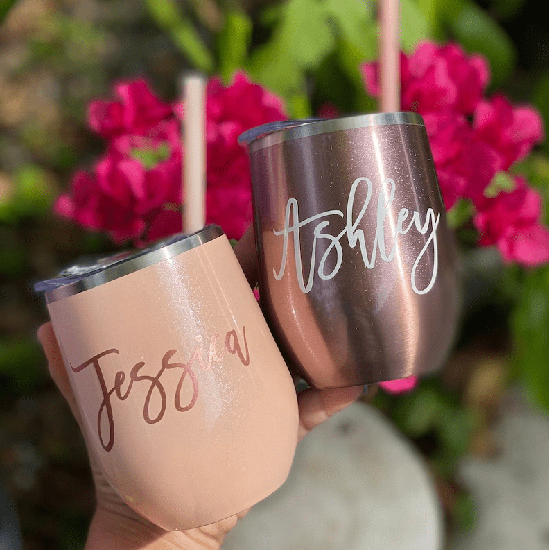 Add a little sparkle to your gift with these 12 oz glitter wine tumblers available in 11 cute colors. With 24 vinyl colors and 12 fonts to choose from, you’ll have your pick of personalization.